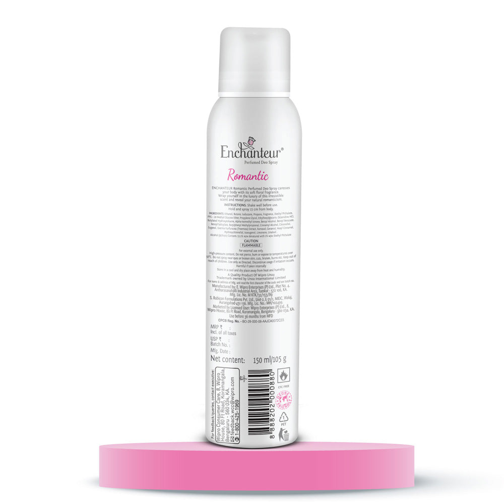 Enjoy the feeling of being pampered with Roses, with Enchanteur Romantic Perfumed Deo Spray. We've crafted the fragrance of this Deodorant for women using classic French perfume-making techniques. Luxurious Bulgarian Roses, White Jasmines and sweet Vanilla create an enchanting bouquet. It doesn't just make you feel utterly feminine, but also gives the romantic in you the freshness confidence.