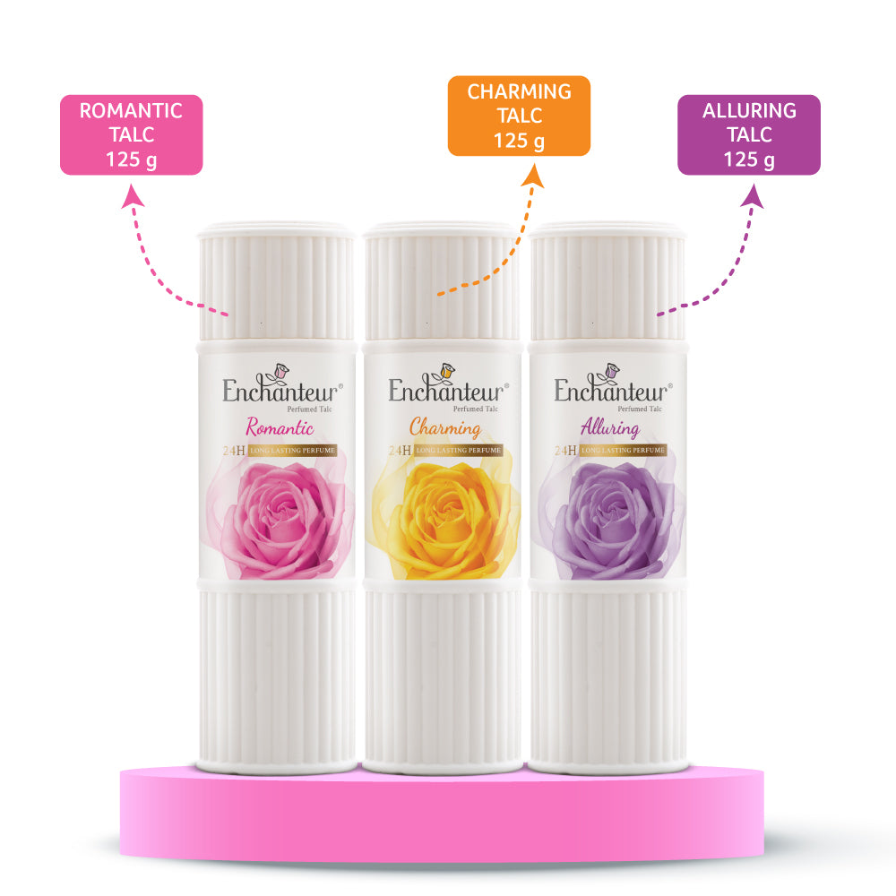 Let the soft caress of Enchanteur Alluring Perfumed Talc pamper your skin. This Talcum Powder for women is a sweet symphony of Passionfruit Flowers, Roses and Vanilla. We've made it with fine grade powder that is easy to apply on both the body, and the face. So you can enjoy a radiant, even-toned look while your fragrance captivates that special someone.